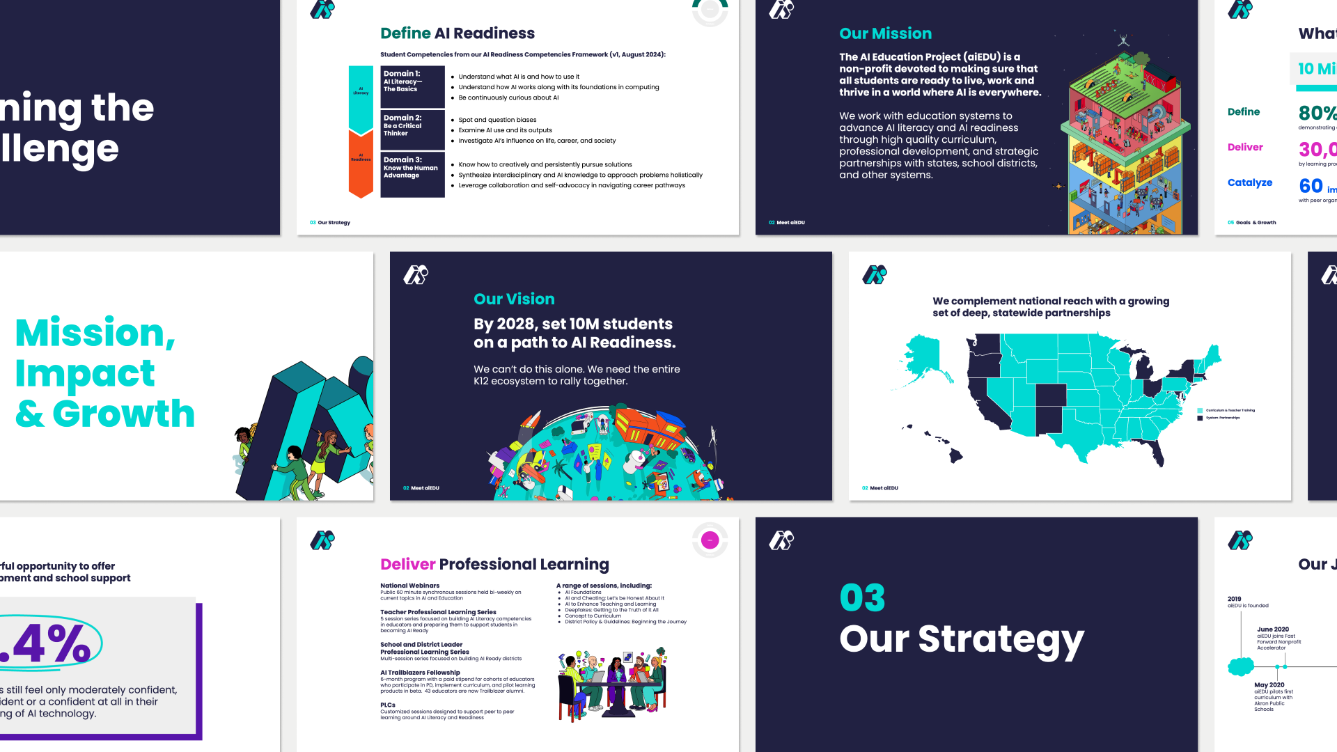 After the rebrand, I worked directly with the nonprofit as Senior Creative Advisor, further expanding and refining the brand. Highlights include a full design refresh of the aiEDU website, new collateral for education frameworks and fundraising, presentation and print templates, and the brand launch of aiEDU Studios.